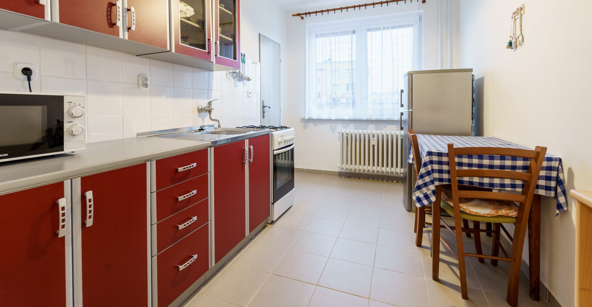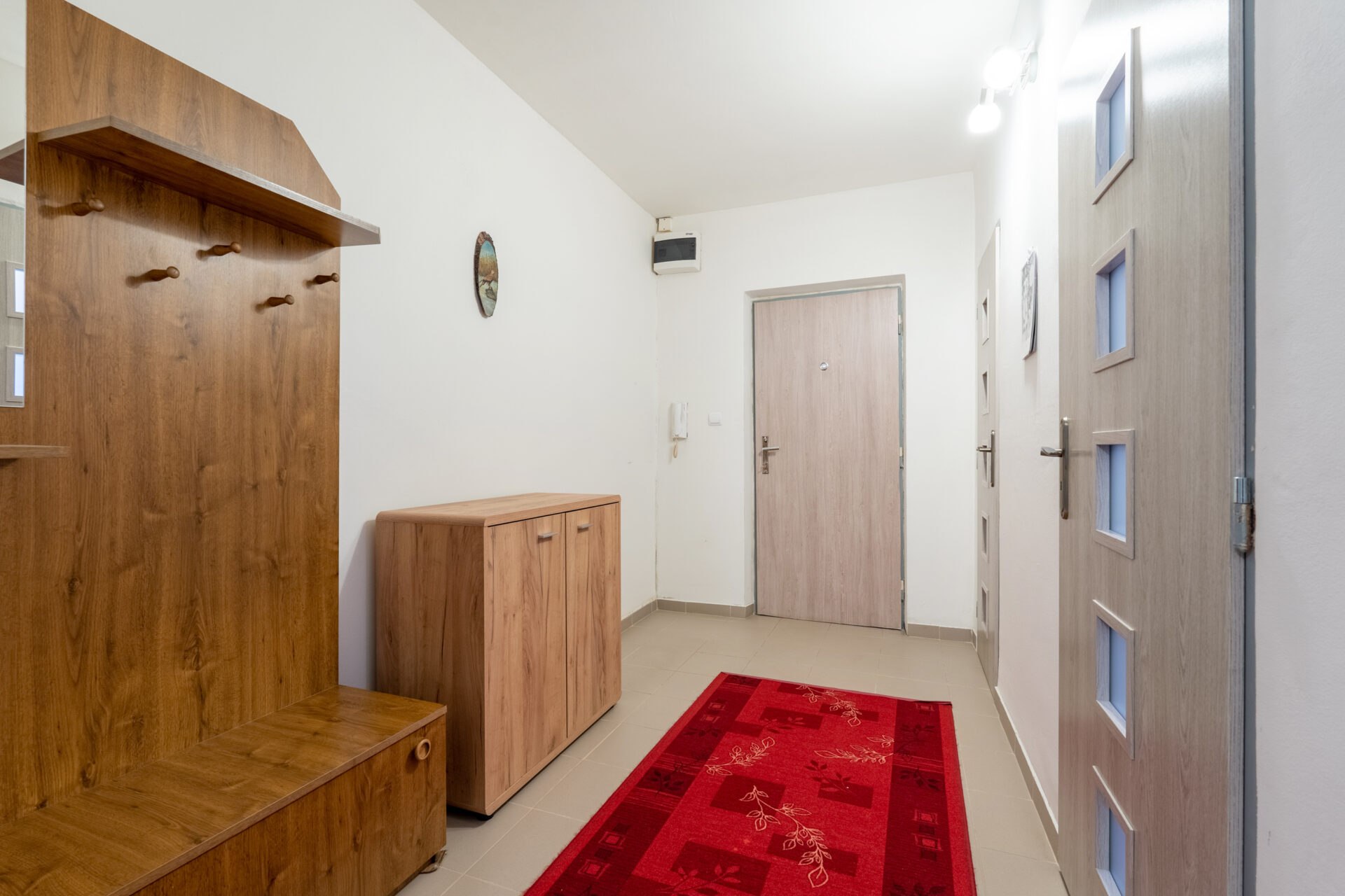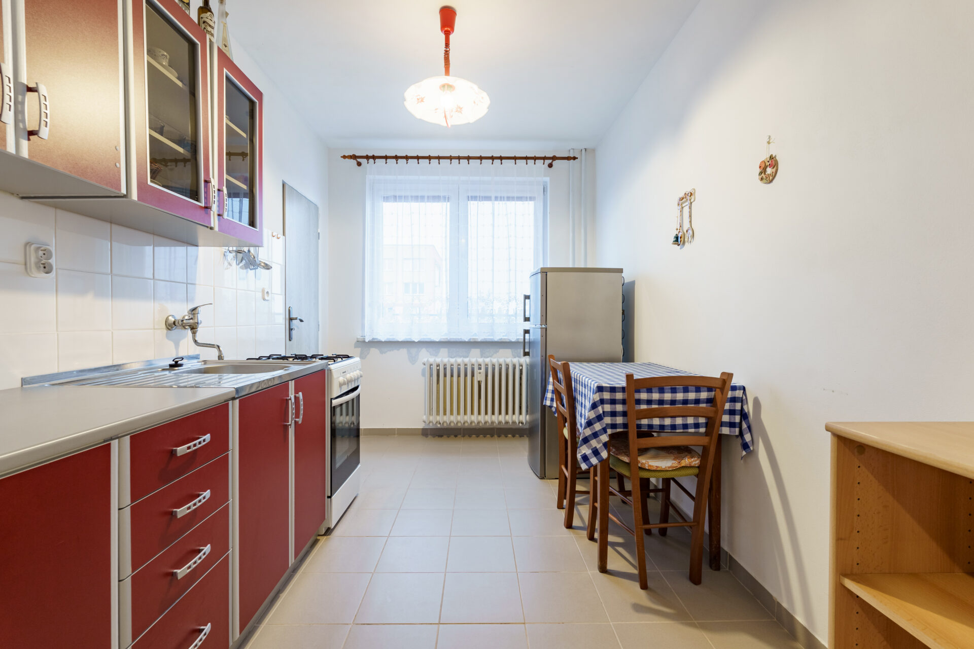Kuchyně s dostatkem úložného prostoru, protože je zde vybudovaná samostatná spíž, kam uložíte každou potřebnou konzervu i lahev. Světlá koupelna samostatná, s vanou, toaleta zvlášť. K tomu dva samostatné, neprůchozí pokoje orientované jeden na východ, druhý na západ.