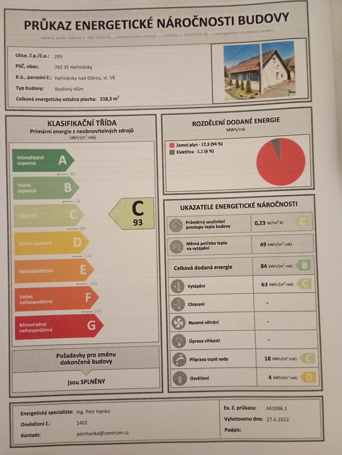 V domě je nově instalovaná elektřina – včetně přívodu do domu, odpady, podlahy včetně zateplení, omítky. Dům 4+kk, na každém podlaží koupelna s toaletou. V přízemí se nachází kuchyň s jídelnou, obývací pokoj a již zmíněna koupelna s toaletou. Dále v přízemí jsou dvě technické místnosti, jedna slouží jako kotelna a prádelna, lze využít i jako dílnu pro kutila. V technické části vybudován nový komín, který je připraven pro další typ vytápění. V podkroví jsou 2 pokoje a druhá koupelna se sprchovým koutem a toaletou. Celý dům vytápěn plynem – v patře radiátory a v přízemí navíc kombinace radiátorů s podlahovým topením.